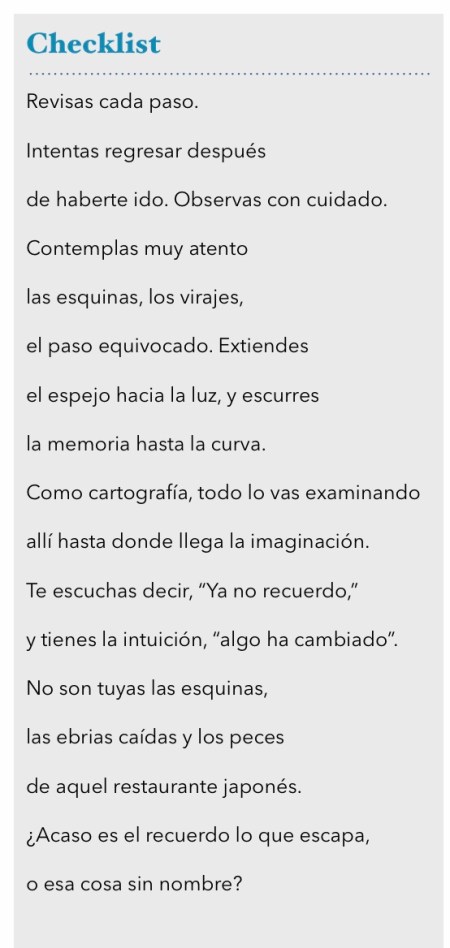 Incluye los poemas, Checklist, Insomnio, Esa pesada calma y Primeras Nupcias.Gracias llenas de cariño a sus editores, Dafne Benjumea y Diego Álvarez Miguel, por darle hogar a estos poemas. Aquí uno de ellos.